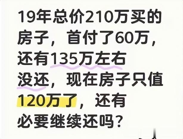 也有网友提出:19年总价210万买的房子,首付了60万,还有135万左右没还,现在房子只值120万了,还有必要继续还吗?