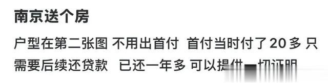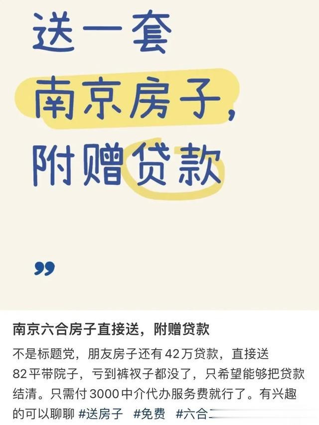 前期江宁滨江的大华锦绣前程有业主在社交平台发帖:当初首付20多万,月供6千,如今贷款已经还了1年多,本金还有130多万。现在他不想继续还房贷了,免费赠送,直接过户,只要买房者接着还剩余贷款就行。